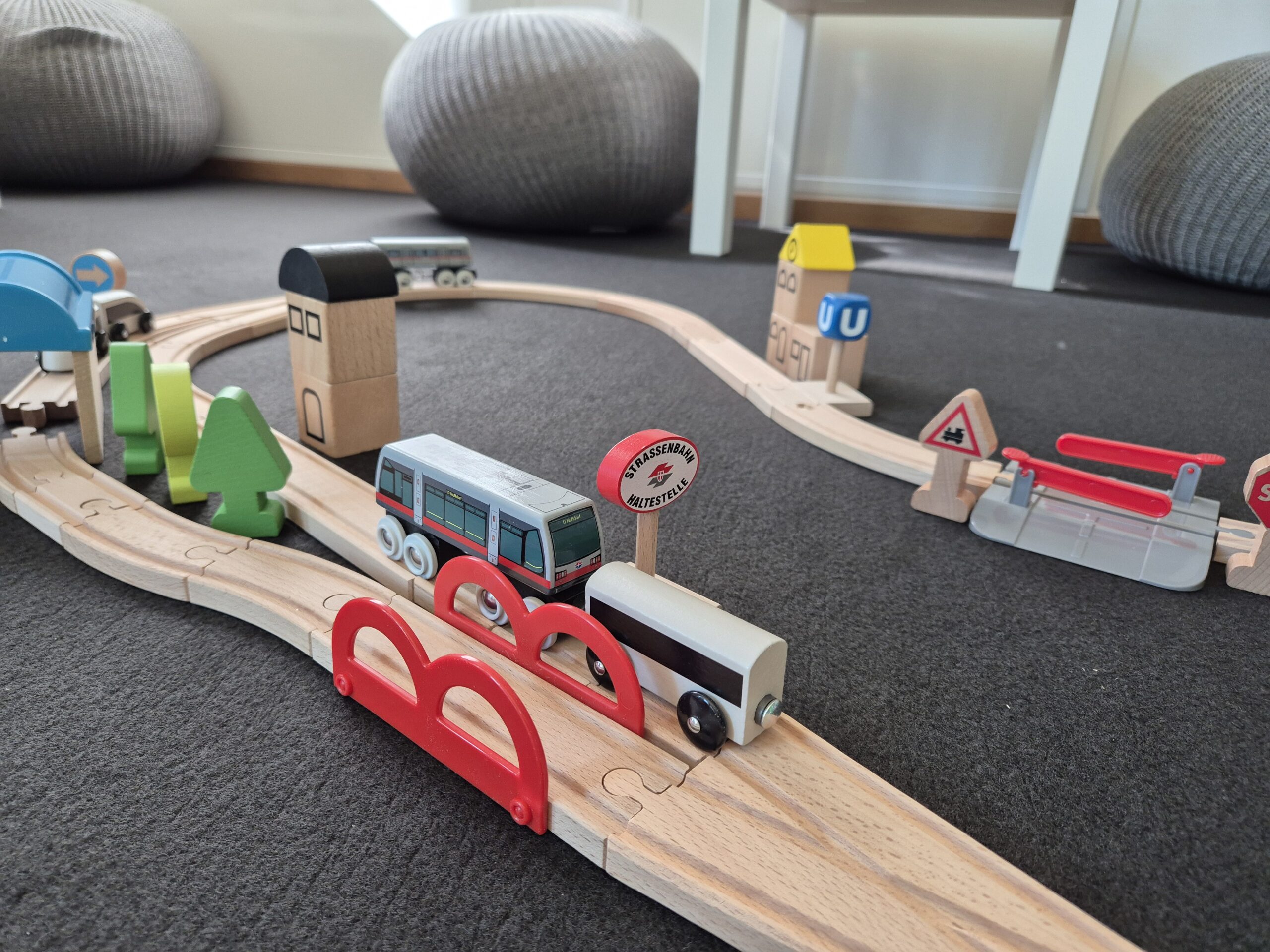 Für die kleinen Gäste gab es eine liebevoll gestaltete Spiele-Ecke – thematisch passend mit einem Straßenbahn-Set aus Holz, inklusive Gleisen und Waggons. So wurde das Thema Stadtentwicklung auch spielerisch erlebbar gemacht.
