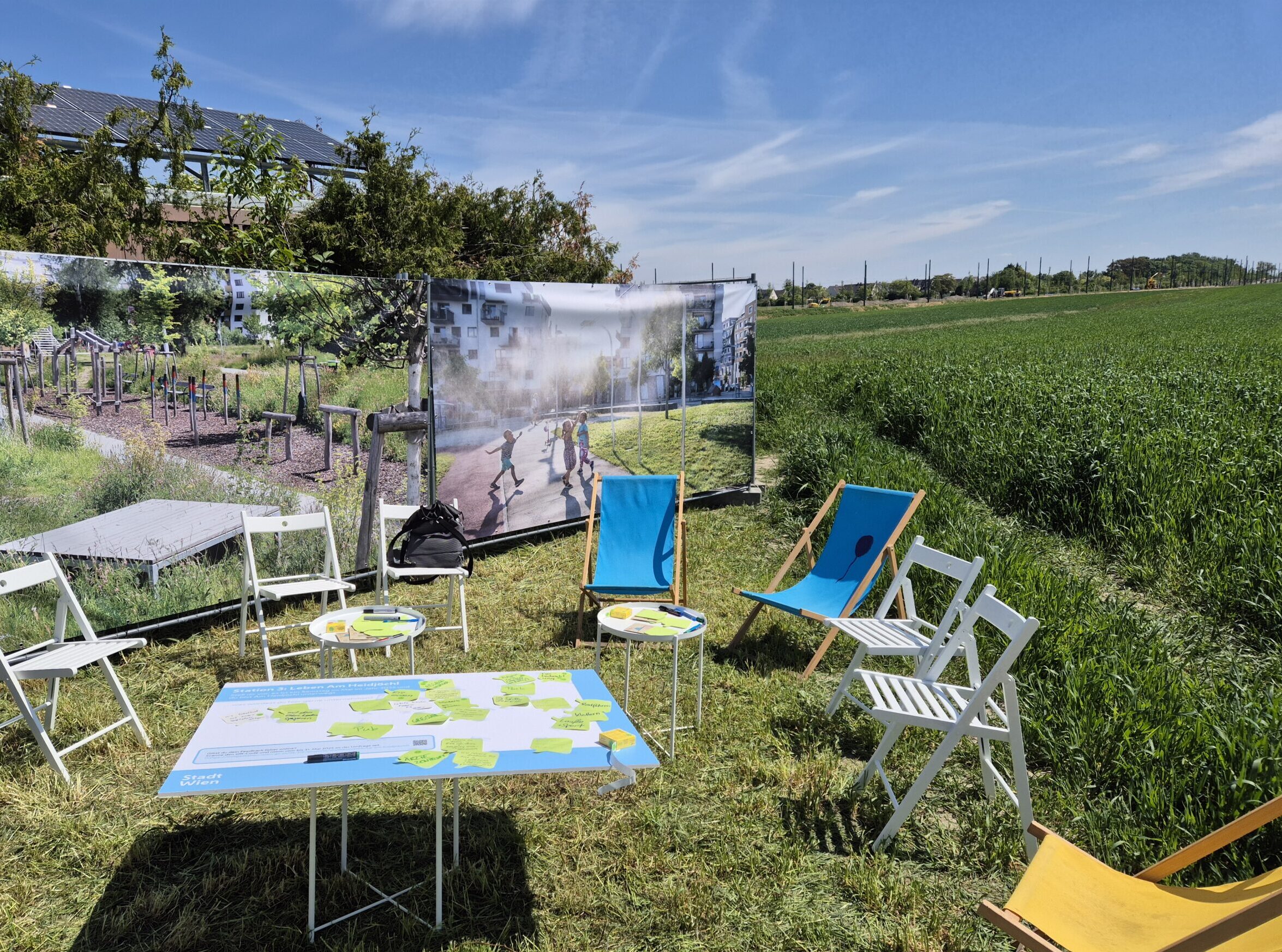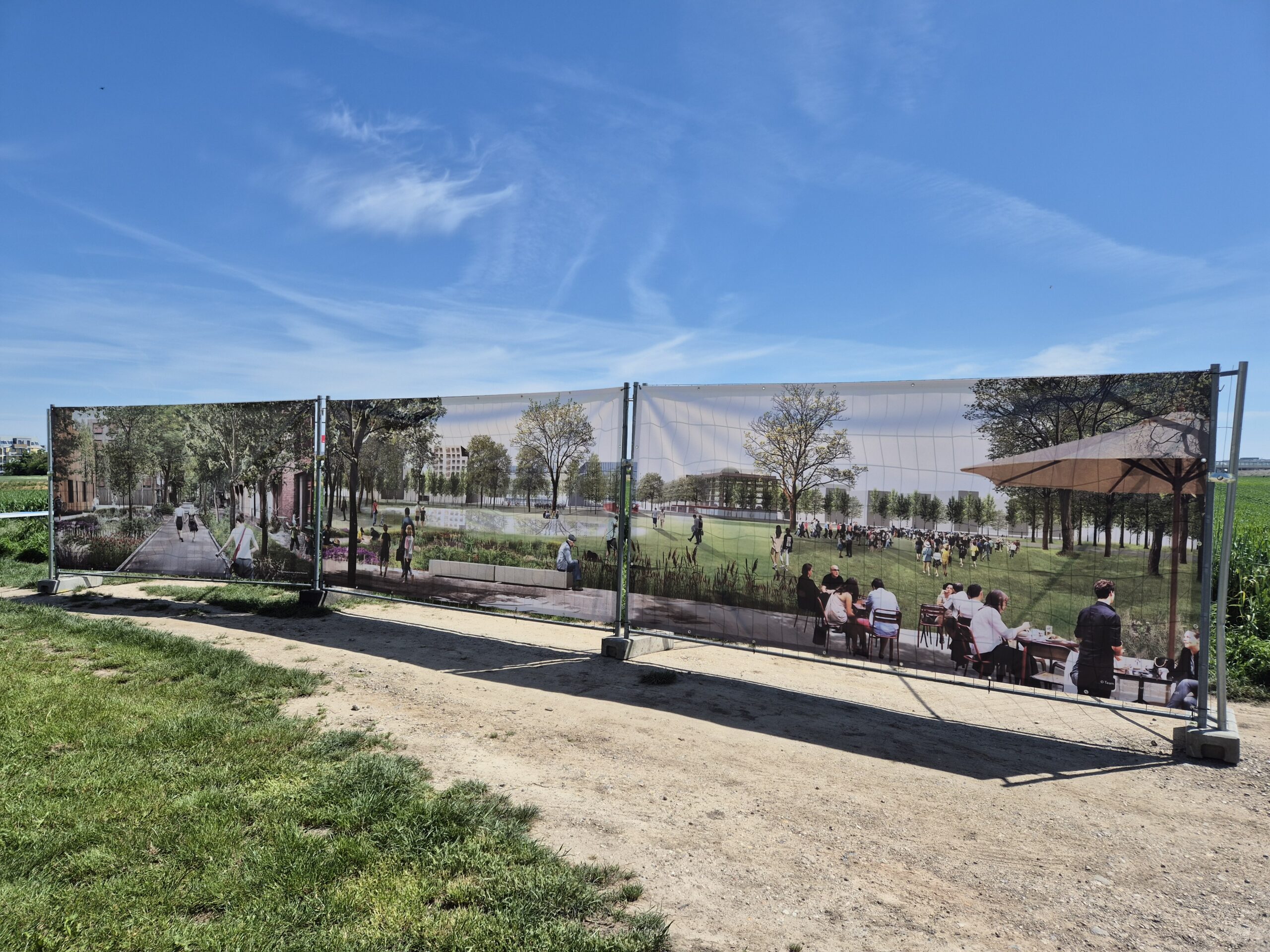 Ein besonderes Highlight war die inszenierte „Straßenbahnhaltestelle“, die mit viel Liebe zum Detail aus Eigenproduktion entstand – inklusive Haltestellenschild, Parkbank und Wartebereich. Ergänzt wurde das Gelände durch thematisch gestaltete Bauzäune mit bedruckten Planen, die die zukünftige Entwicklung des Quartiers visualisierten.